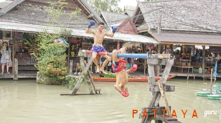 - Мастера тайского бокса проводят показательные бои на площадках, висящих над водой.