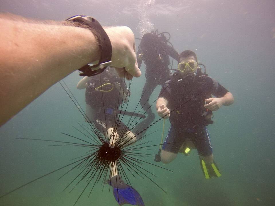 Недалеко находится черепаший остров, он неспроста так называется. В том уголке обитали черепахи, но сегодня трудно найти морского обитателя среднего размера, чем и отличается остров от побережья Фукуока, там животных хоть отбавляй. Дайверы в окрестностях оставляют лодку первыми. Люди не спеша плюхаются в воду. Коралловый риф красивый, но вместо рыб, скатов и черепах лишь изредка попадается мусор.