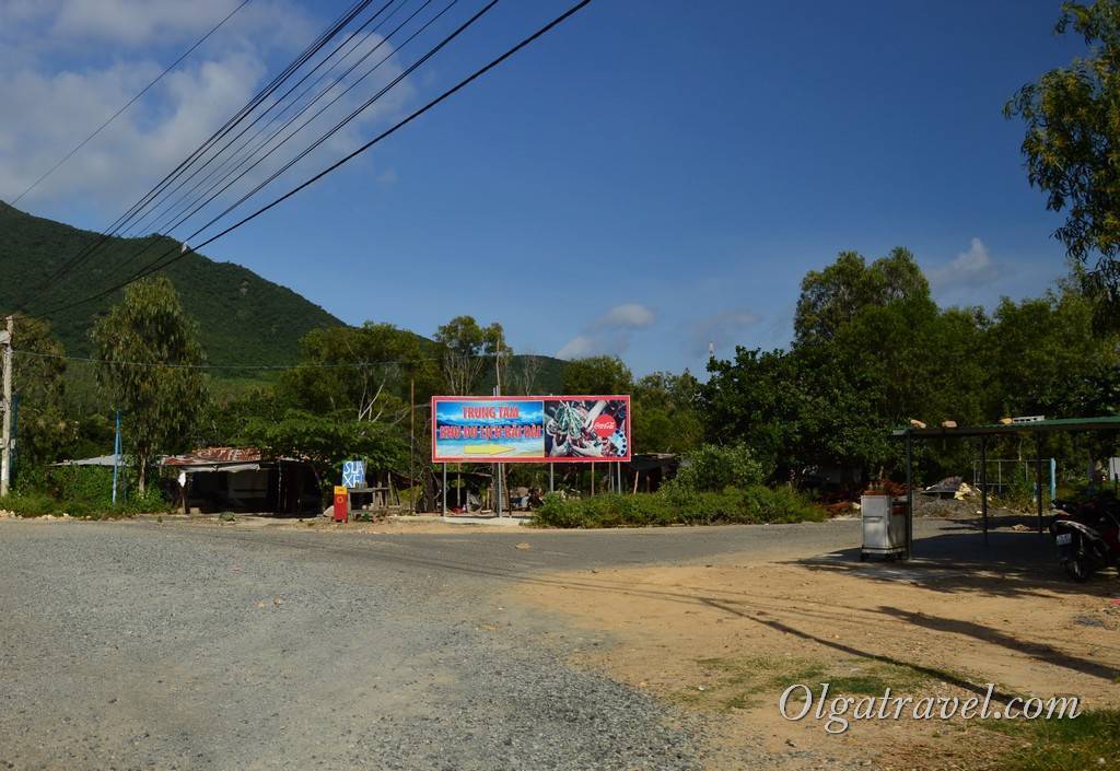 В самом начале пляжа под горой несколько кафе, где можно недорого поесть морепродукты и арендовать пляжный стульчик под навесом. В выходные дни здесь толпы вьетнамцев! Указатель на поворот к одному из кафе на берегу