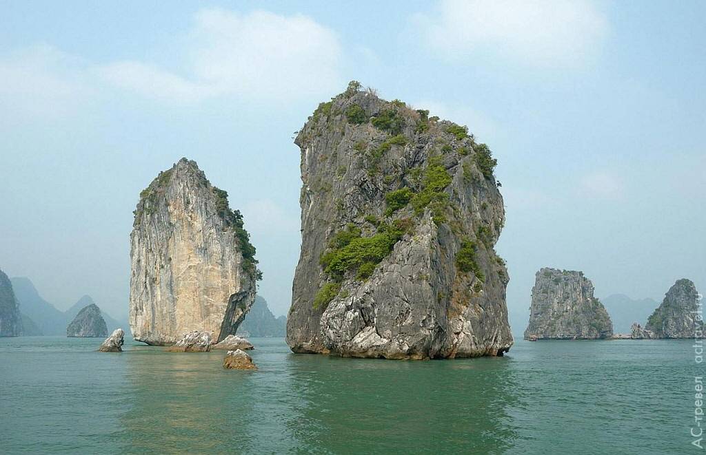 Живописные скалы Петушок и Курочка в заливе Халонг стали одним из символов Вьетнама, их можно найти даже на вьетнамских банкнотах