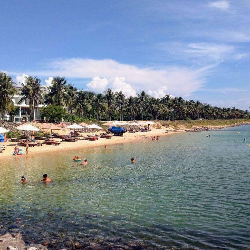 Это действительно жемчужина Вьетнама. Но, чтобы попасть сюда, придётся взять такси или заказать экскурсию (примерно 33-35 у.е). По-другому сюда не доберётесь – место находится на приличном расстоянии от города. Принадлежит отелю, и вход на него платный. Но хоть раз побывать тут стоит. Фотографии получаются бесподобные. Небольшой пляж с зонтиками, сделанными из натуральных материалов, околдовывает какой-то натуральной первобытной красотой.
