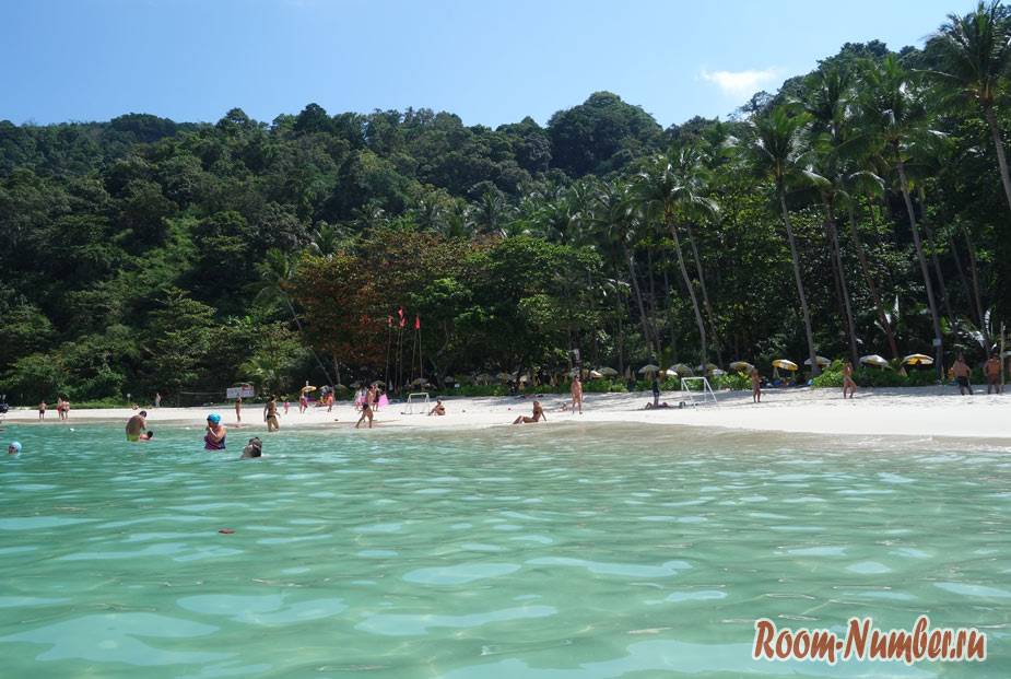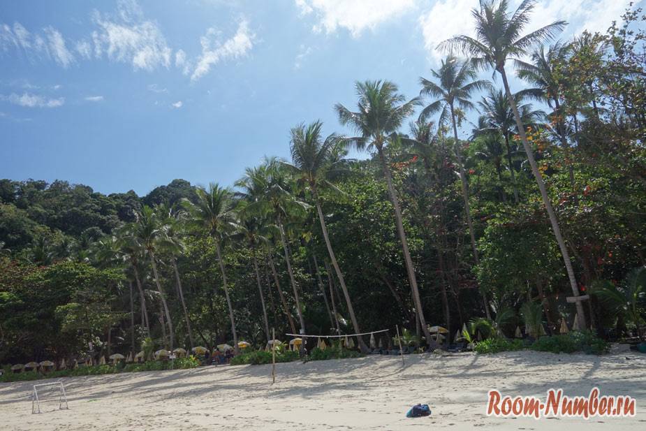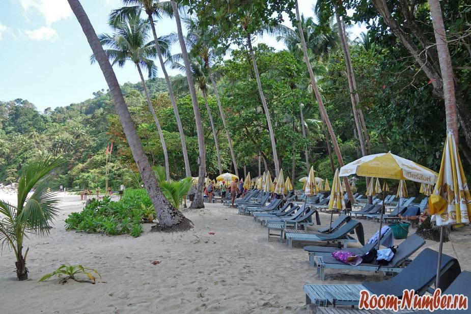 Тень на пляже есть только утром. В полдень тень уже отсутствует. Свои зонтики ставить строго запрещено. Можно арендовать лежаки с зонтиками под пальмами. Шезлонги в стоимость входа не включены и оплачиваются отдельно — 100 бат за лежак. Активнее мажьтесь кремом от солнца и не пренебрегайте головными уборами.