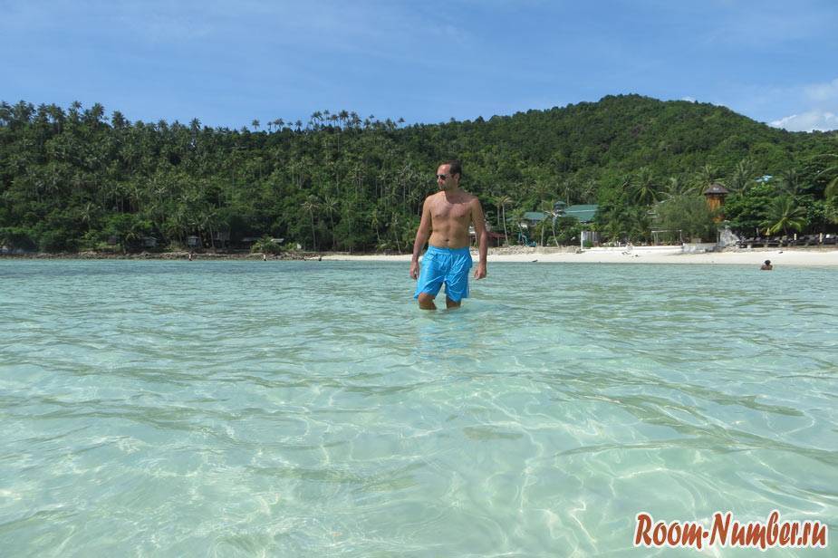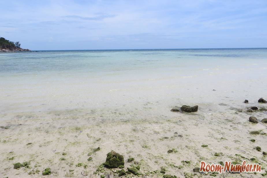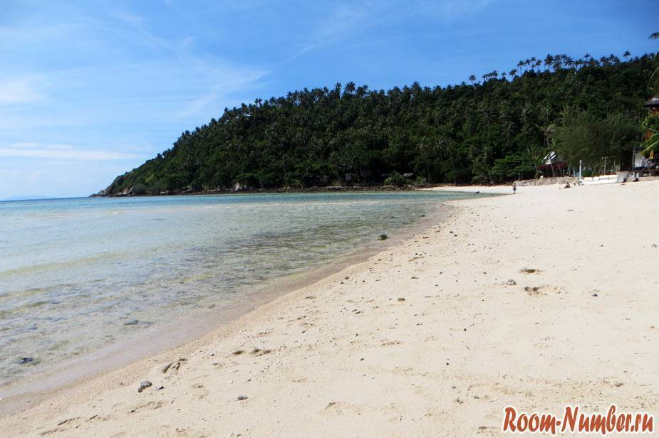 Мы приехали на Панган летом, когда здесь сезон отливов. Поэтому не смотрите, что воды мало. По отзывам, в высокий сезон вода доходит почти до пальм, оставляя узенькую полоску песка 3-5 метров шириной.
