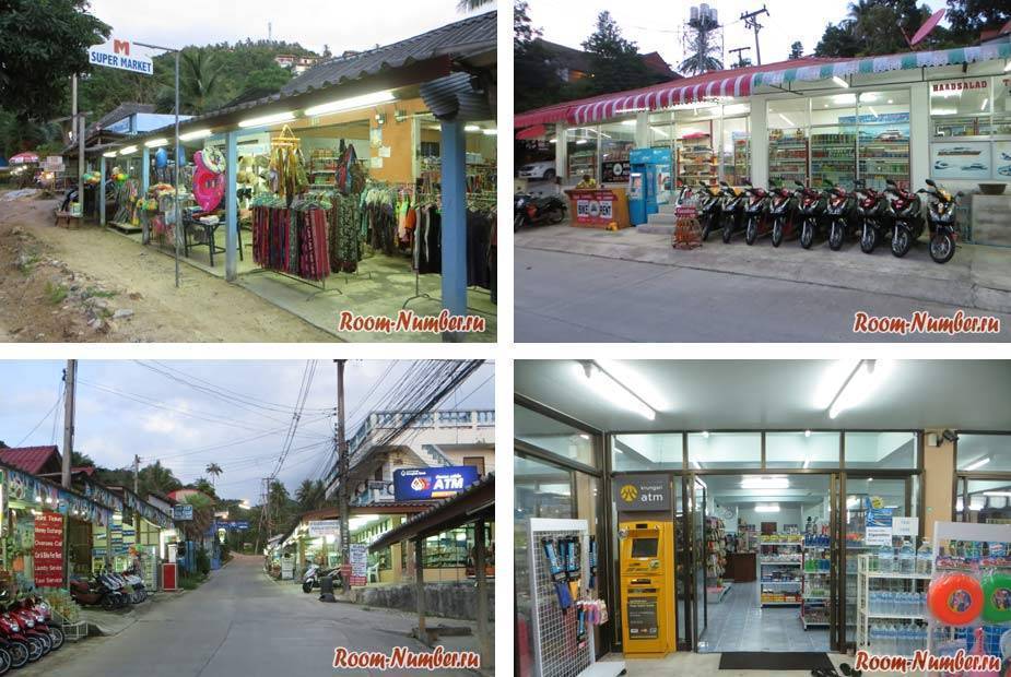Забавной особенностью Haad Salad является наличие десятка крупных (по островным меркам) магазинов, расположенных друг напротив друга. В них можно купить воду, алкоголь, чипсы, орехи и прочие закуски, сладости, крема от загара, купальники и пляжную одежду и тому подобные товары. Каких-то нормальных продуктов практически нет. Цены завышены, но не слишком сильно. Есть несколько банкоматов.