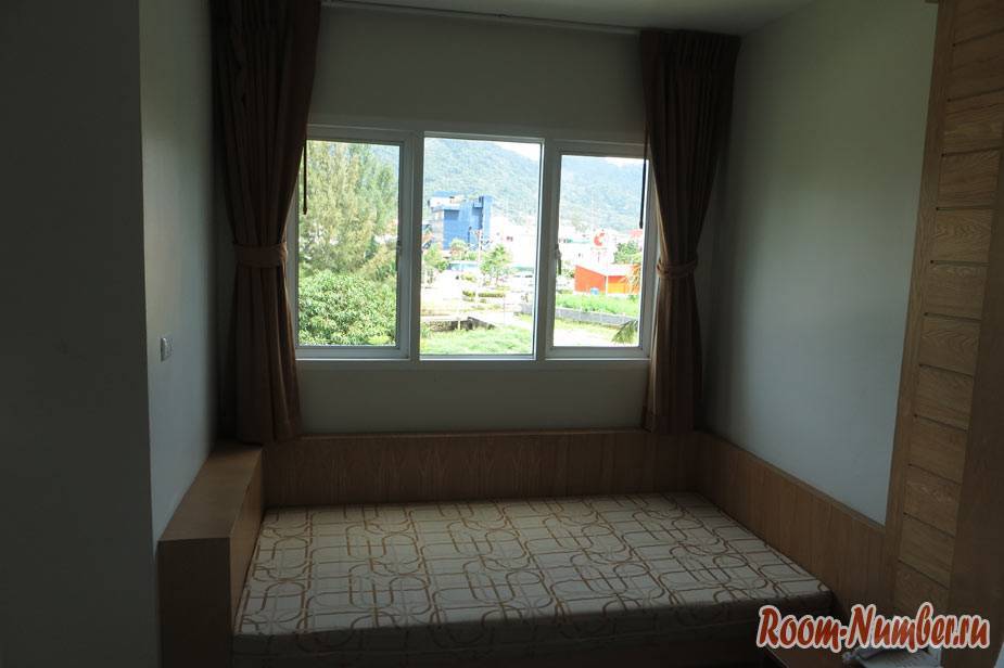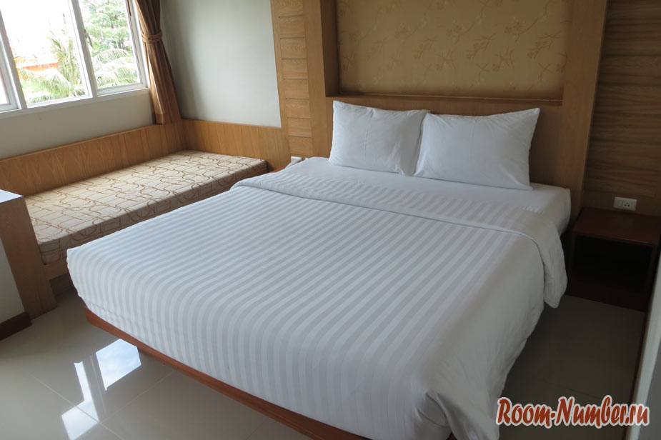 Номер достаточно просторный. Большая и очень удобная кровать «кинг сайз». Чистое постельное белье. Возле кровати стоит какой-то непонятный самодельный диван.