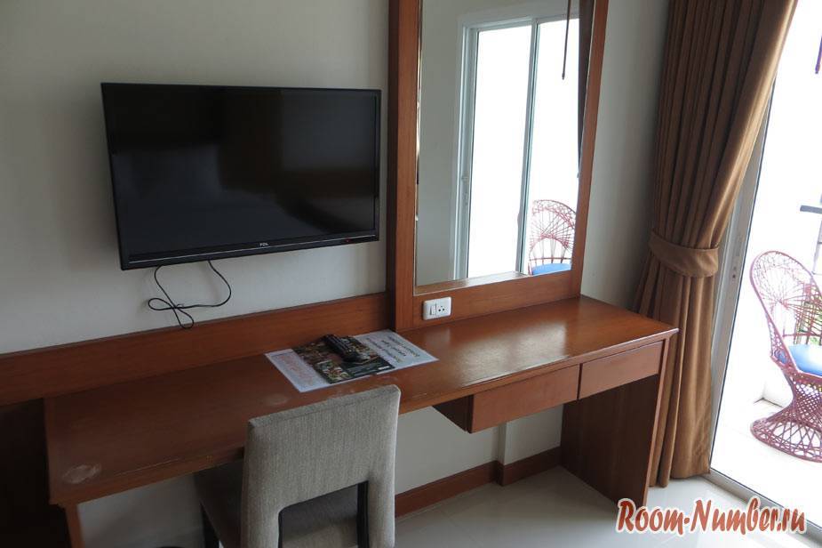 На стене прибит современный телевизор. Показывает более чем 70 каналов, включая два русских. Иногда включаем фоном, когда мы кушаем в номере.