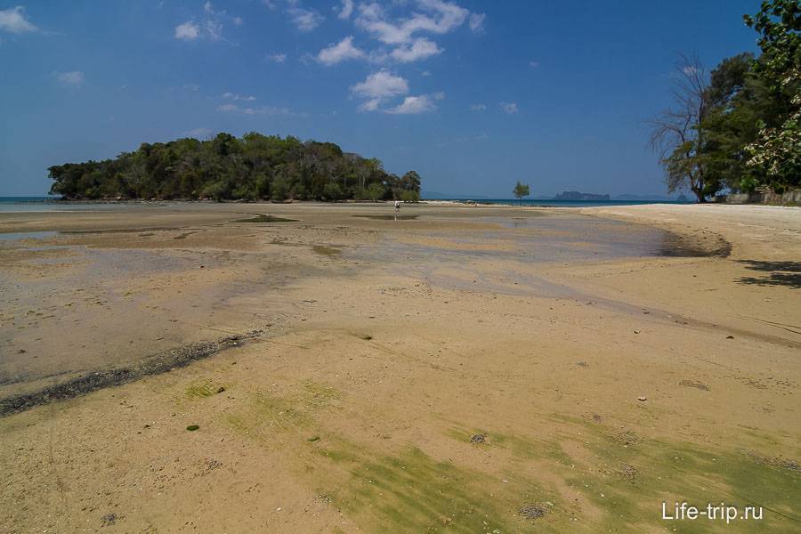 В отлив можно дойти пешком до ближайшего острова Пляж Клонг Муанг по середине, вид направо в сторону отеля Софитель