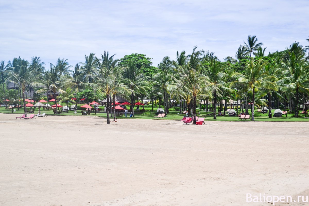 Песок на пляже – светло-желтый, крупный, искусственный. На пляже могут быть водоросли и мусор, около отелей убираются, закапывают мусор в песок. Волны у побережья бывают редко, после обеда устойчивый отлив, заход в воду плавный. Подходит для маленьких детей. Для взрослых придется привыкать к мелководью, по колено. Аренда лежаков от 50000 рупий.