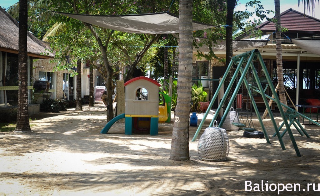 Почему Санур называют “детским пляжем”? Многие отели ориентированы на семейный отдых. Вот, к примеру, любимая детская площадка нашей дочки при отеле Segara Village. Качели-карусели. Теннис, шахматы, бильярд. И для пользования всем этим, тут не обязательно жить.