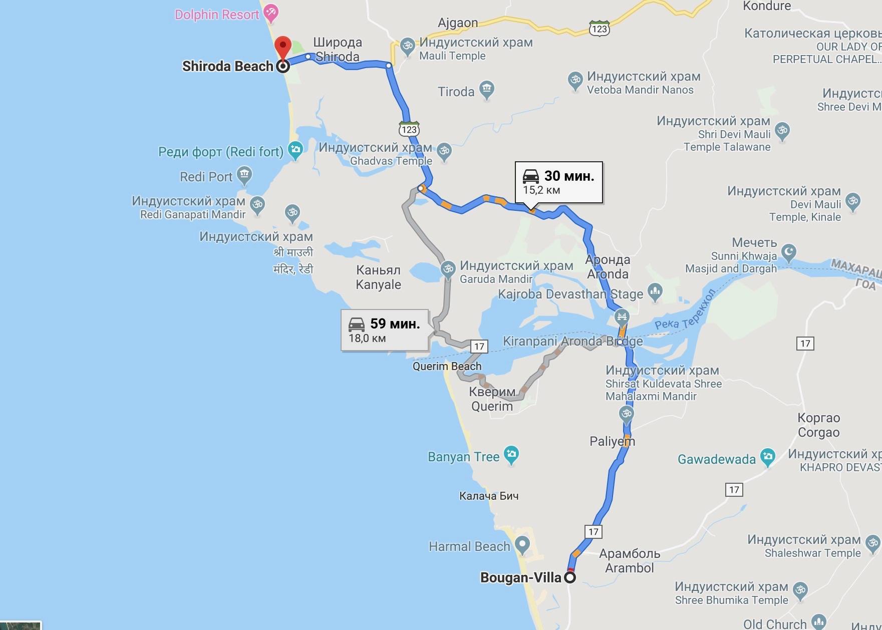 Растояние от Арамболя пятнадцать киллометров, на скутере вы преодалеете за 35 минут спокойной езды. Вбейте в карту вот эти координаты и выставьте маршрут 15.769373, 73.661935 такой же как на скрине ниже.