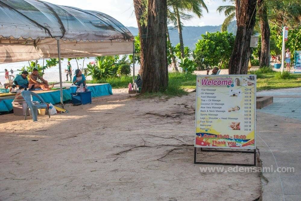 Рядом с Лаян бич есть небольшое кафе с напитками и тайской едой, по выходным и ближе к вечеру к пляжу подъезжают макашницы со всякими вкусностями, а рядом много места для парковки.