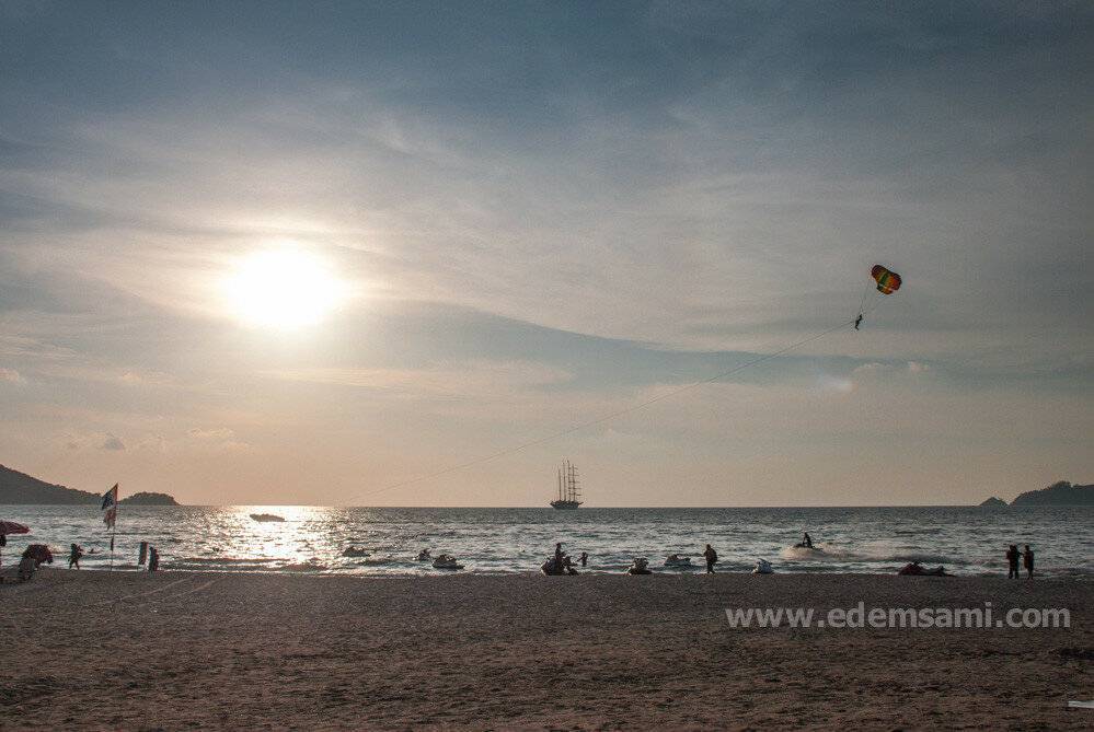 Сам пляж довольно широкий и с довольно светлым песком. Он мне не показался грязным. Море, кончено, ни разу не лазурное, но и волна ниже, чем на других пляжах – Найхане и Ката-Кароне. Вид налево, вид направо.