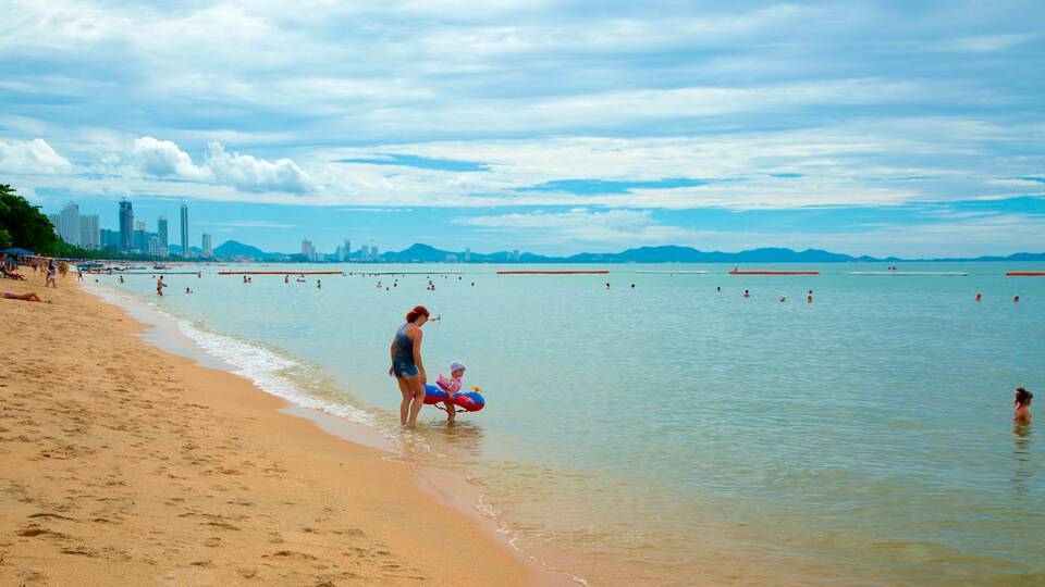 Берет начало на юге города от главной тусовочной улицы Walking Street и тянется 3 км до северной его части. Пляжная зона в центре города доходит до 20 метров в ширину. Несмотря на шумность и многолюдность песчаный пляж относительно чистый с зонами, выделенными для купания и загара, оснащенными зонтиками шезлонгами и лежаками. Здесь настолько тесно, что лежаки располагаются близко один к другому, а шезлонги установлены по побережью в несколько рядов, доходя до кромки воды. По пляжу постоянно ходят тайцы, предлагая еду, сувениры и услуги массажа.