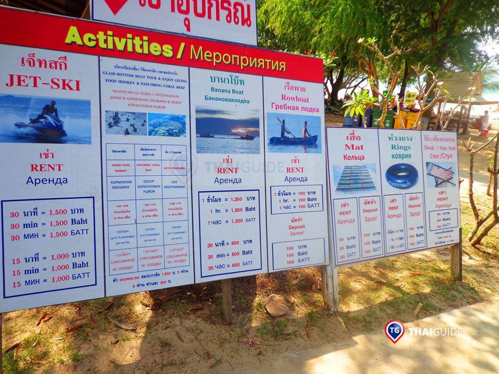 - Водный мотоцикл — 1000 Бат/15 минут, 1500 Бат/30 минут