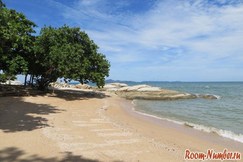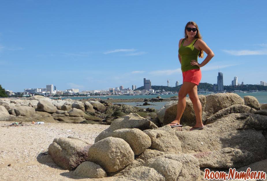 Мы спустились на пляж в левой части, с его южной стороны. О том, как добраться до Вонгамата, читайте ниже. В самой южной части располагается дикий пляж с большими камнями, как на островах. Там немного грязновато, но открываются чудесные виды на Паттайю. Можно сделать отличные фото на камнях.