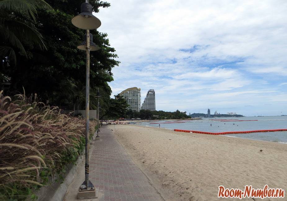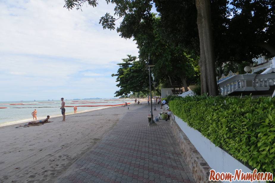 Мало кто знает, но на пляже Wong Amat есть набережная. Обычно на туристических сайтах, которые друг у друга копируют статьи, написанные фрилансерами, говорится, что никакой набережной нет, но это не совсем так. Здесь нет улицы с машинами вдоль берега, как на центральном пляже Паттайи или на Джомтьене. Но пешеходная зона есть, которая протянулась от пляжа Центара вдоль всего берега. Так приятно погулять вдоль пляжа в тени деревьев.