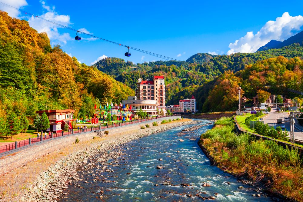 Золотой осенью можно в полной мере насладиться в горах Красной Поляны. Здесь находятся экстремальный скайпарк и курорты с канатными дорогами, которые поднимут вас на самый пик. Активные туристы могут прогуляться по пешеходным маршрутам, заглянуть в парк водопадов «Менделиха», прокатиться на зиплайне.