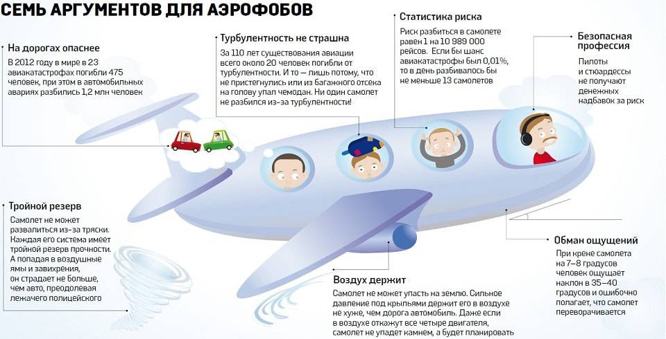 Два человека из трех относятся к перелетам с опаской Исследования показали, что перелетов боятся 70% пассажиров. А 25% людей страдают ярко выраженной аэрофобией. Чаще других ей подвержены управленцы, люди, привыкшие все контролировать. Дело в том, что, прежде всего, аэрофобия связана с осознанием беспомощности. От пассажира ничего не зависит, повлиять он на полет не может, это и влечет чувство паники. Также в основе аэрофобии могут лежать другие страхи — замкнутого пространства или высоты.