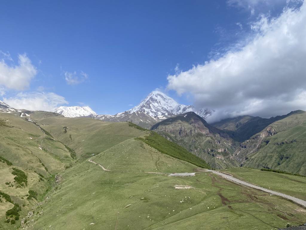 Степанцминда находится сразу после спуска. Здесь масса отелей, в которых можно остановиться. Есть варианты на любой карман. Вокруг очень красиво. Утром мы объехали округу и прямо зарядились.
