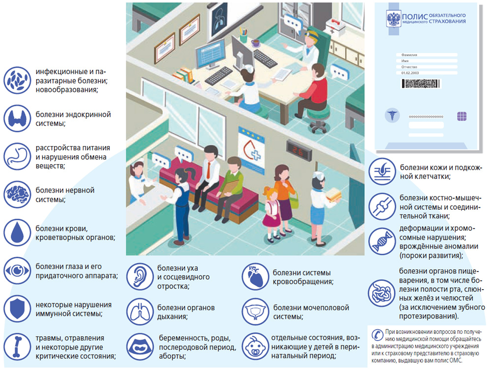 Познакомиться с базовой программой ОМС и перечнем заболеваний можно здесь. Разъяснения по частым вопросам можно найти на официальном сайте Фонда ОМС.