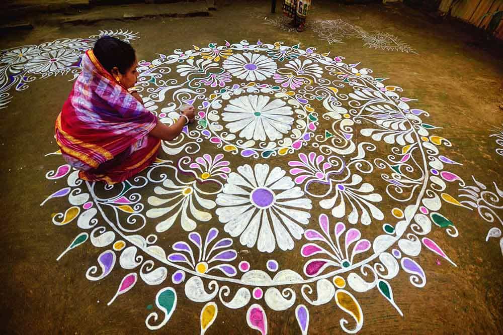 Ранголи в Индии рисуют возле главного входа в дом. Вот как это происходит.