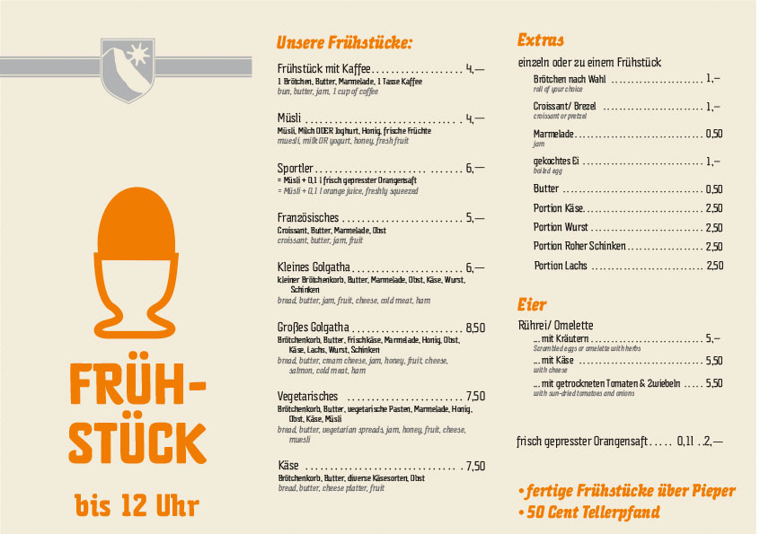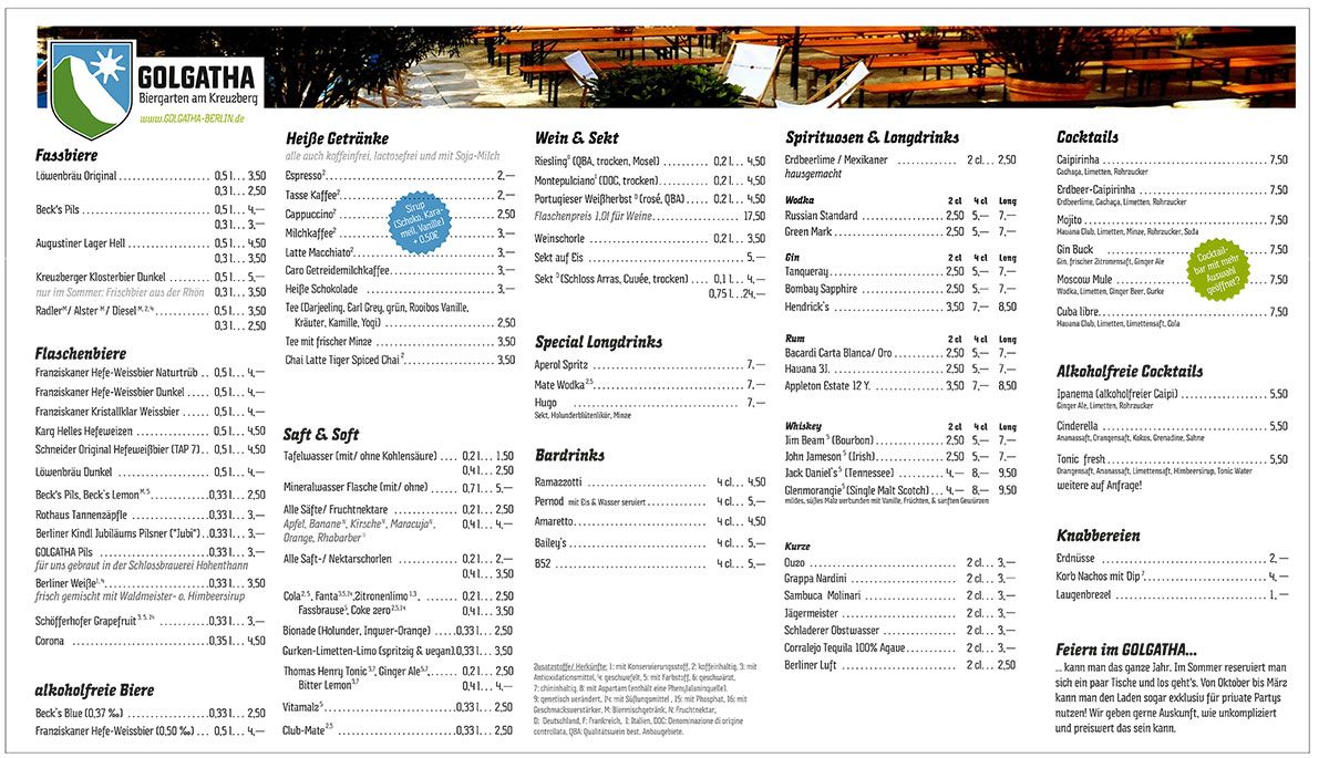 С 1977 года трактир на окраине Виктория-парка приглашает полакомиться поджаренными на гриле восхитительными домашними колбасами, вкусным свиным стейком, филе дорады и мясным паштетом. Днем здесь можно посидеть в тени деревьев с традиционным бокалом отборного немецкого пива, а вечером – пропустить бокал вина в коктейль-баре. Ночь в Golgatha принадлежит любителям танцев. В 10 часов вечера диджей делает музыку погромче, и начинается дискотека, продолжающаяся до первых лучей солнца.