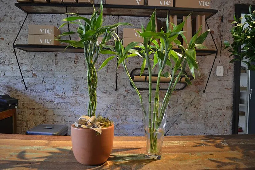 Причудливые спирали и живые завитки стеблей этого уникального растения оригинально декорируют любой интерьер. Неприхотливость, способность бамбука благоухать в воде и на суше позволяют украшать узкие стеклянные вазоны и даже аквариумы.