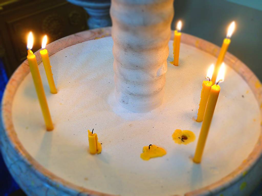 Не передать словами ощущение радости и благодати, когда ты находишься один в таком чудесном светлом месте, где открыты ставни и совсем нет духоты, вредных старушек, которые выдергивают твою свечку стоило лишь поставить ее в подсвечник. Кстати о свечах. Очень удобно сделано. Свечи здесь ставятся не в подсвечники как у нас, а в белый кварцевый песок, поэтому они догорают полностью. Затем песок просто обновляют.