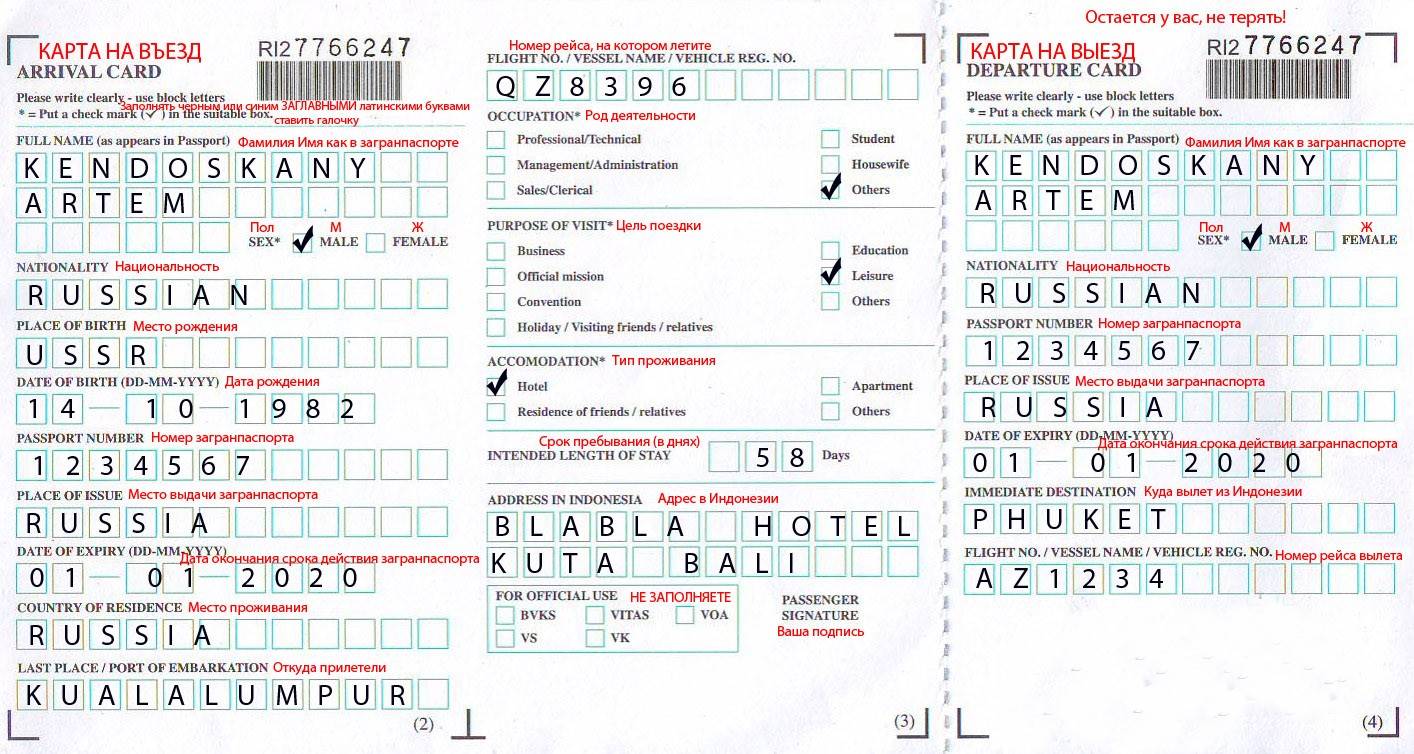- Миграционная карта. Заполнить ее можно в аэропорту либо в самолете. Образец заполнения ниже. Миграционная карта состоит из двух частей. Одну турист отдает во время прилета, другая потребуется перед вылетом либо при продлении визы.