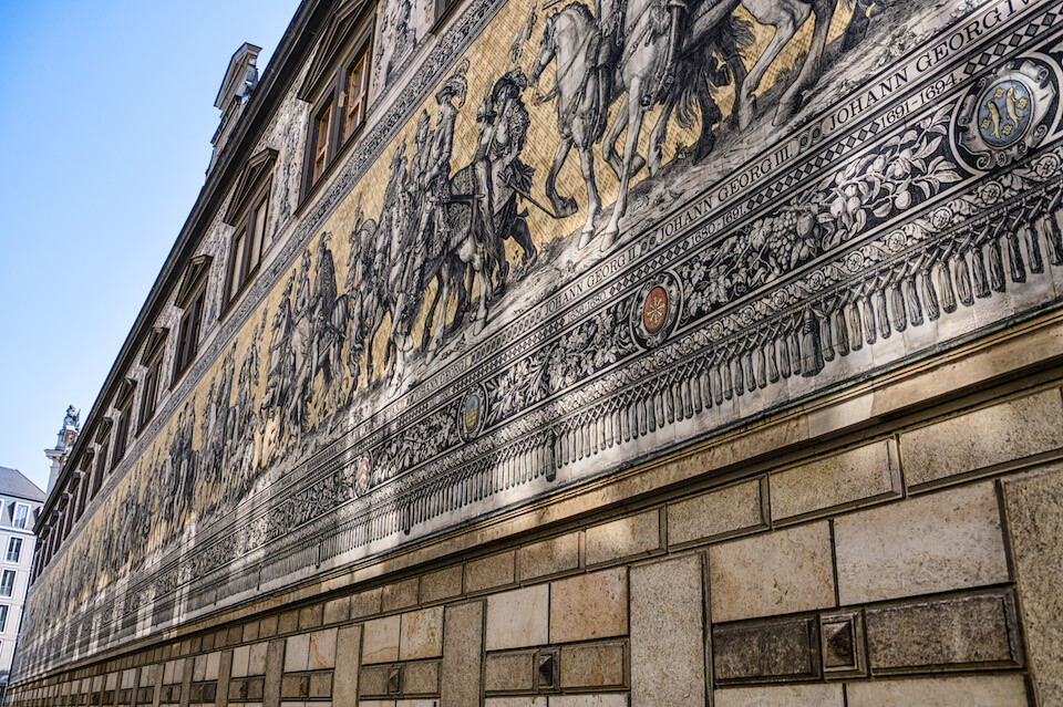 Достойна внимания и ведущая к замку-резиденции внешняя сторона галереи Конюшенного двора. Ее украшением служит уникальное панно, на создание которого ушло 25 тыс. бесшовно уложенных фарфоровых плиток знаменитого Мейсенского завода. На необычном полотне длиной 101,9 м изображена конная процессия. Среди ее 94 участников — князья, короли, ученые, люди искусства, крестьяне и солдаты. Возглавляет шествие Конрад Великий — родоначальник династии Веттинов.