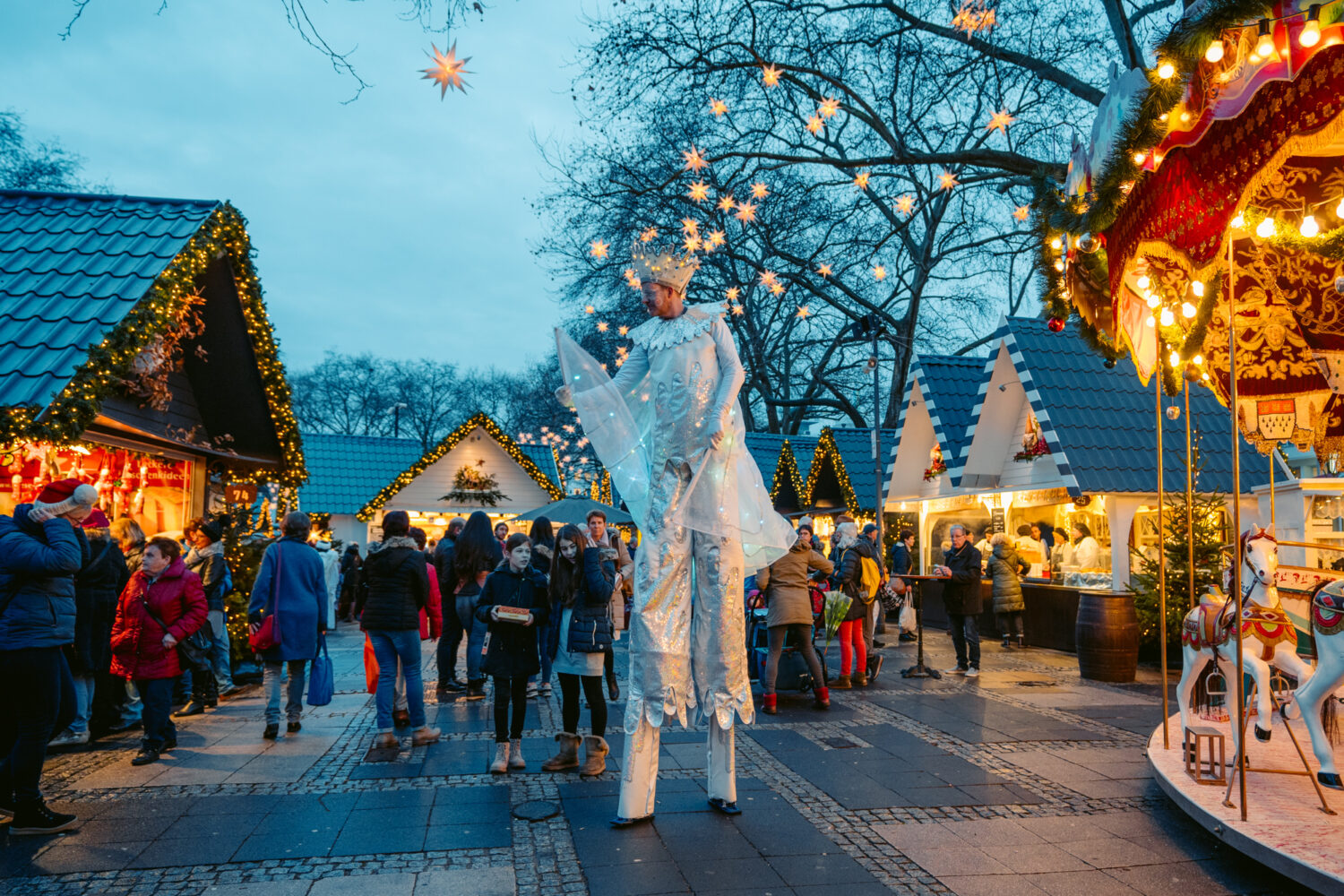 Рождественский рынок ангелов (Markt der Engel) находится на площади Ноймаркт в Кельне, где над деревьями висят скопления красивых звезд, создавая волшебную атмосферу, которую усиливают артисты, одетые как настоящие ангелы… .. да, даже на ходулях!