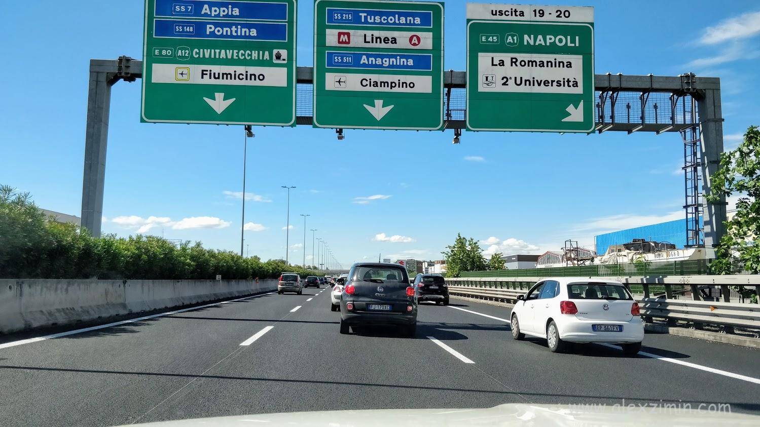 Указатели на трассе на римские аэропорты Чампино и Фьюмичино. А если направо пойдешь, в Неаполь попадешь