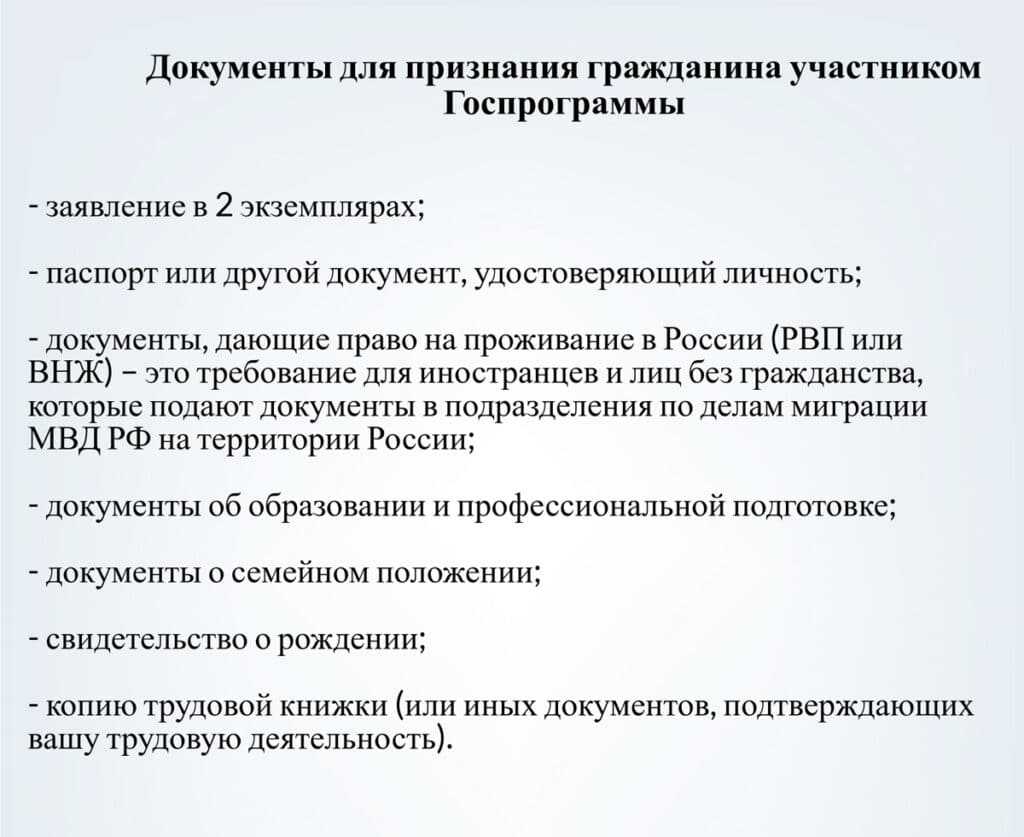 Перед тем, как стать участником программы переселения соотечественников, нужно подготовить необходимые бумаги. Список небольшой, в него входят: