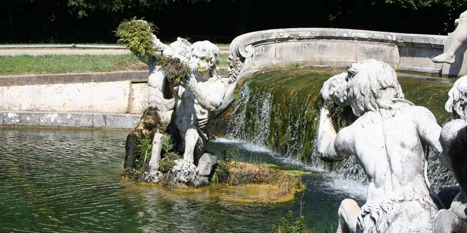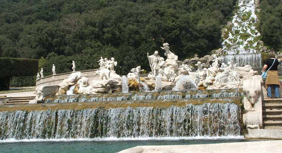 За партером следует каскад из фонтанов – Маргарита – выполнен достаточно просто. В нем последовательно разместили 4 бассейна. Перспектива завершается Большим каскадом. Вода, поступающая из акведука, льется с высоты 82 метра. Снизу расположился обширный бассейн, вокруг которого разворачивается мифологическая сцена: Диана, которая собирается купаться в компании Актеона и нимф.