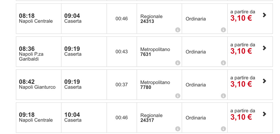 Если желаете чуть-чуть сэкономить, то добраться до Казерты можно на поезде из Неаполя с вокзала Napoli Centrale. Он ходит каждые полчаса. Поездка занимает 46 минут. Билет стоит 3,1 евро.