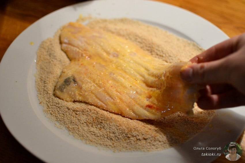 - Хорошо подойдет панировка из сухарей. Их нужно измельчить до мукообразного состояния. И сюда можно добавить разнообразные наполнители: сыр, зелень, орехи. Филе нужно посолить, поперчить, а затем обвалять в панировке.