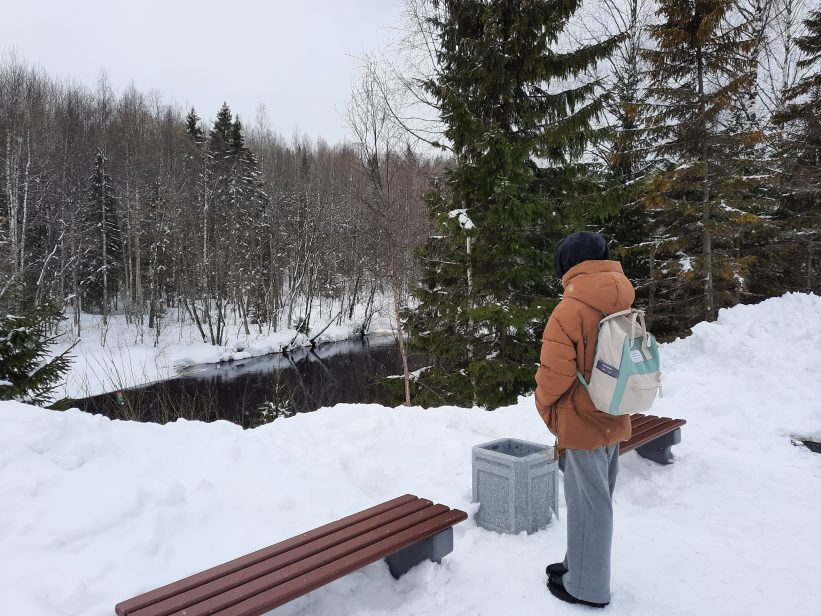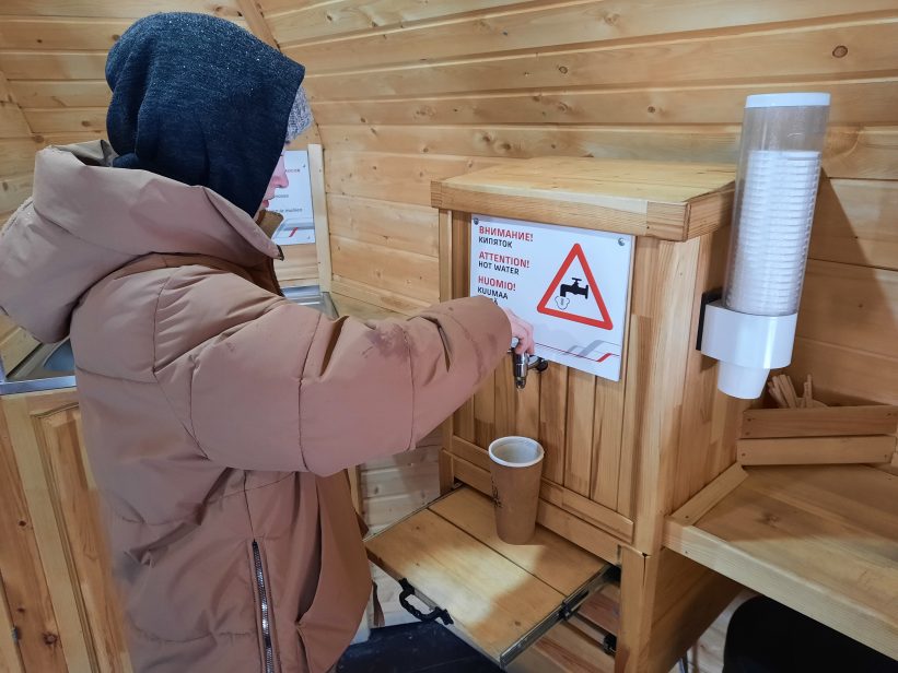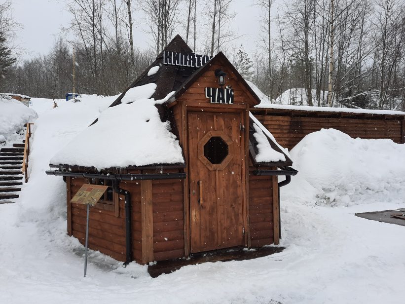 Если вы стеснены в средствах (что казалось бы не логично, ведь приехали в довольно недешевый аттракцион под названием Горный парк). Но все же. Мы давно путешествуем самостоятельно и знаем о космических ценах в раскрученных туристических местах. Поэтому в рюкзак берем с собой перекус в виде термоса и бутербродов. На ж/д станции есть вот такой деревянный домик, называется Кипяток — Горячий чай. Он чем-то напомнил мне зимовье, хотя я никогда не была в настоящих избушках лесника, но по описанию из книг очень похоже. Внутри довольно уютно, пахнет деревом, он отапливается, есть кулер с горячей водой и раковина. Если у вас есть с собой пакетики, можно заварить и тут же перекусить на скамейках. Если нет — можно купить, внутри стоит автомат с чаем.