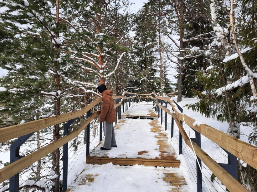 - Съездить на желтом “ПАЗ-ике” до Рускеальских водопадов, стоимость в одну сторону 50 рублей. Там можно походить по подвесным мостикам, зайти в домик совы и встретить Бабу-Ягу.