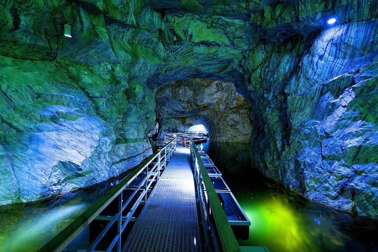 Можно зайти в штольню и спуститься в шахту, где раньше добывали мрамор. Все подсвечивается. Внутри холодно даже летом.