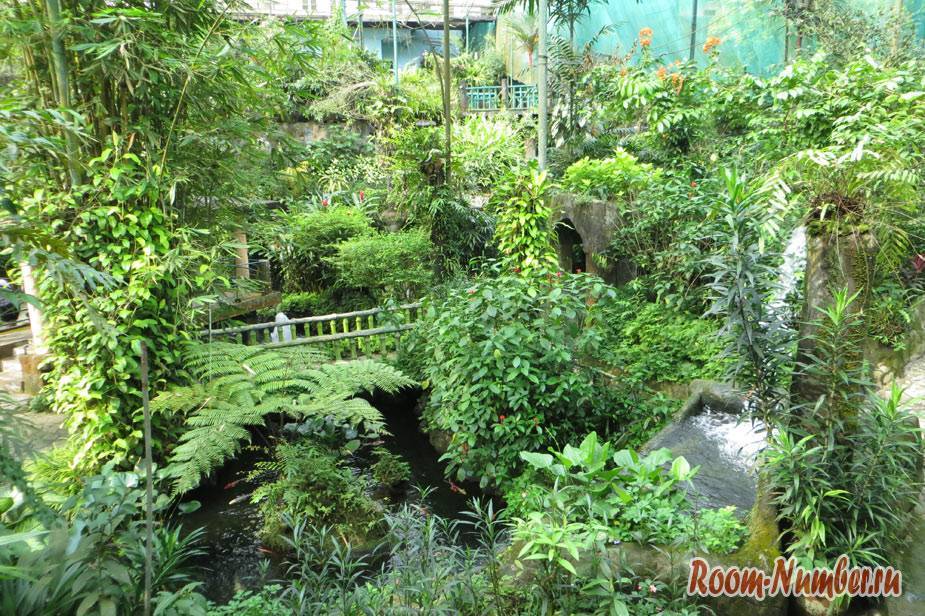 Территория воспроизводит уголок дикой природы с водопадами, зарослями экзотических растений, цветами, яркостью красок похожими на бабочек. Их очень много, всевозможных размеров и окрасок. Они не боятся посетителей, порхают над листьями и ветвями, садятся на плечи и протянутые ладони.