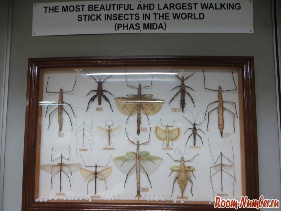 Есть стенды с засушенными образцами бабочек и насекомых, а также множество аквариумов с живыми насекомыми. Многих мы видели впервые в жизни. Не хотелось бы с ними где-нибудь столкнуться. Такие огромные и противные, но для чего-то в этом мире созданные.