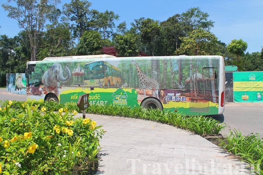 Но проезд только при наличии билета, поэтому билет нужно купить заранее. Садитесь на автобус, на котором нарисован слон и бегемот, он идёт по главной улице в сторону Винперла. В моей деревне Онг Ланг он идёт по дороге TL45, интервал каждые 30-50 минут. Проехать на этом автобусе не в Винперл Фукуок сафари (а например по делам куда-то) не получится. Только до парка и обратно. Последний автобус из парка идёт в 16.30, потом только на такси.