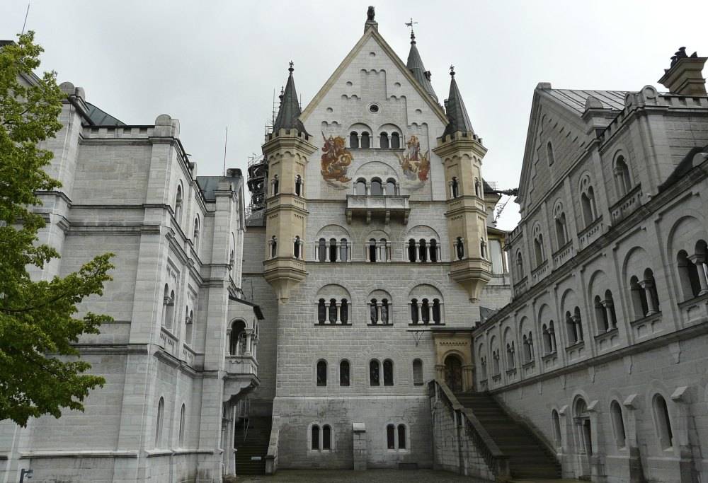 Через главные ворота замка посетители попадают в недостроенную Южную часть внутреннего дворика Нойшванштайна, откуда открывается прекрасный вид на горы.