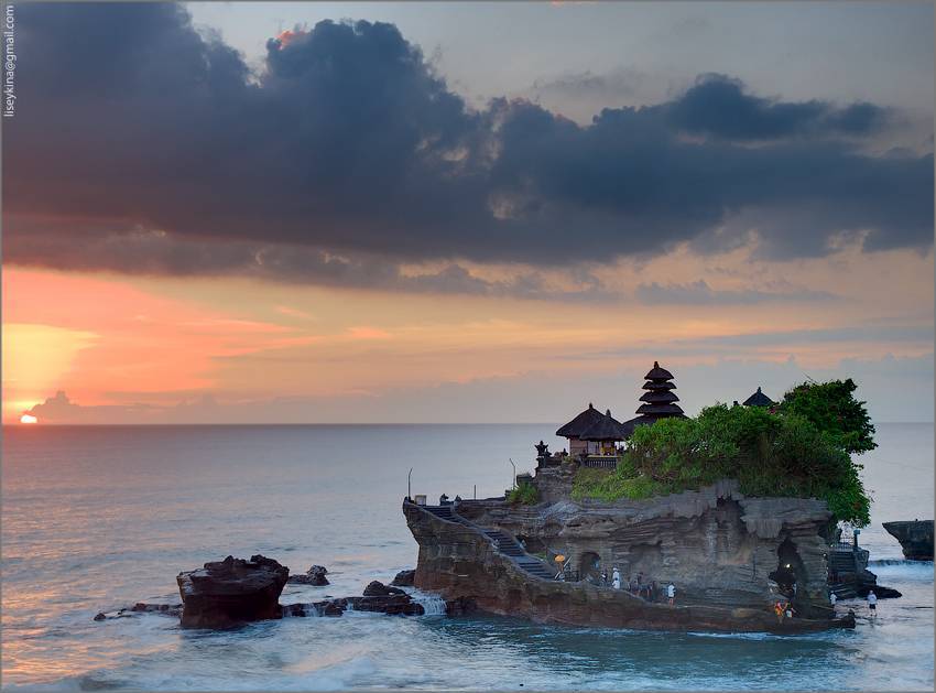 На закатном солнышке Танах-Лот смотрится очень красиво! Любуясь храмом с открывшегося берега, не забывайте следить за волнами, некоторые могут преодолеть рифовые камни и нахлынув затопить вещи, да и вас намочить