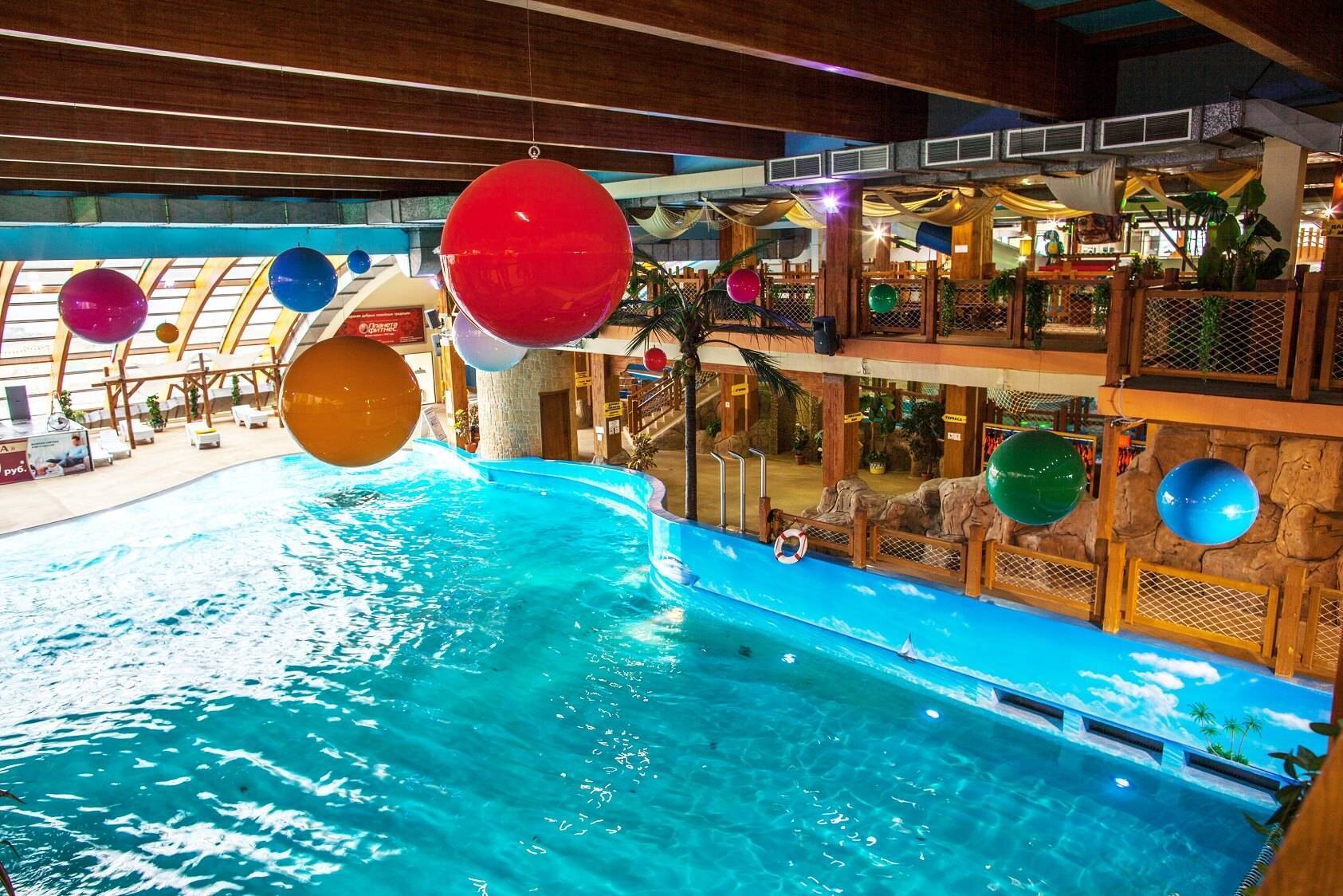 Главное в аквапарке – это, конечно же, бассейн. В самом центре — большой бассейн, впечатляющий размерами и великолепными видами, открывающимися из окон, так что можно почувствовать себя почти что на природе, при этом оставаясь в комфортном температурном пространстве. Если все же хочется свежего воздуха, можно выплыть в открытую часть бассейна, находящуюся не в помещении. Большой бассейн разбит на зоны для тренировок, отдыха, гидромассажа, просто плавания, гимнастики.