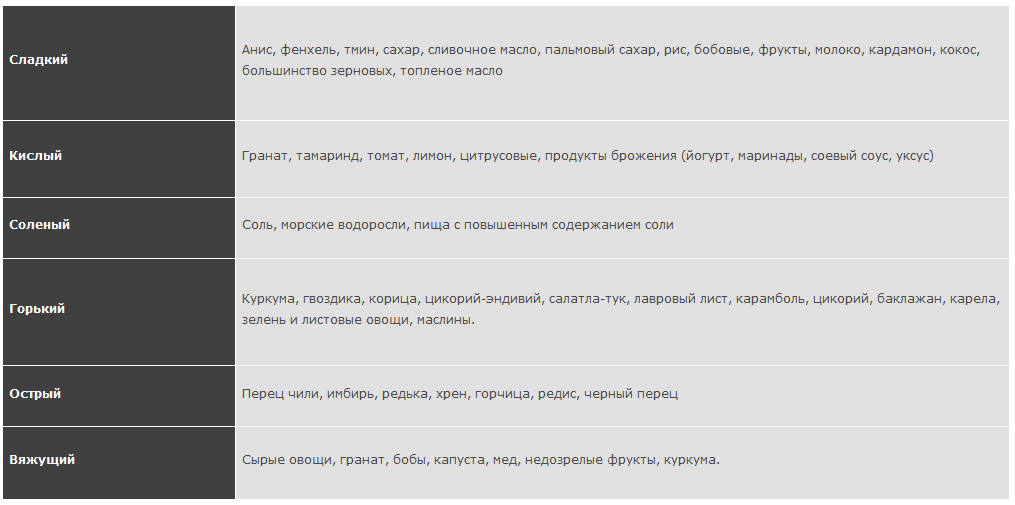- В каждом приеме пищи должны присутствовать 6 вкусов: острый, горький, соленый, вяжущий, кислый и сладкий. Если не будет хотя бы одного вкуса – съедите избыточное количество, прежде чем насытитесь.