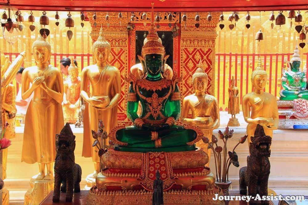 Нефритовая статуя, украшенная золотой одеждой, Изумрудный Будда, согласно легенде, был создан в Индии в 43 г. до н.э. в городе Паталипутра, где он оставался в течение 300 лет. В 4 веке нашей эры буддийские монахи увезли его на Шри-Ланку, чтобы спасти его от разрушения войной. В конце концов, статуя добралась до Таиланда и была перенесена в Ват Пхра Кео в 1779 году.