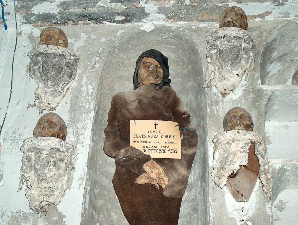 Монах Сильвестро да Губбио – первый человек, чье тело было выставленно в катакомбах. Его мумия по сей день остаётся на прежнем месте с табличкой, на которой указана соответствующая дата – 16 октября 1599 года.