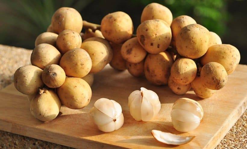 Плоды лангсата начинает созревать к середине лета. Много-много шариков внеше похожих на картошку, прикрепленных к ветке – так выглядит это лакомство. Некоторые находчивые туристы сравнивают его с семечками. Не из-за вкуса, а потому как его необходимо чистить, словно семена подсолнуха, от кожицы и идут шарики на ура в дружной компании за беседой.