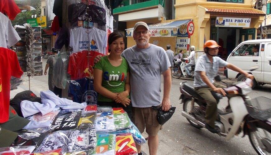 Tourist Taking Photos with Friendly T-Shirt Seller in Hanoi Old Quarter